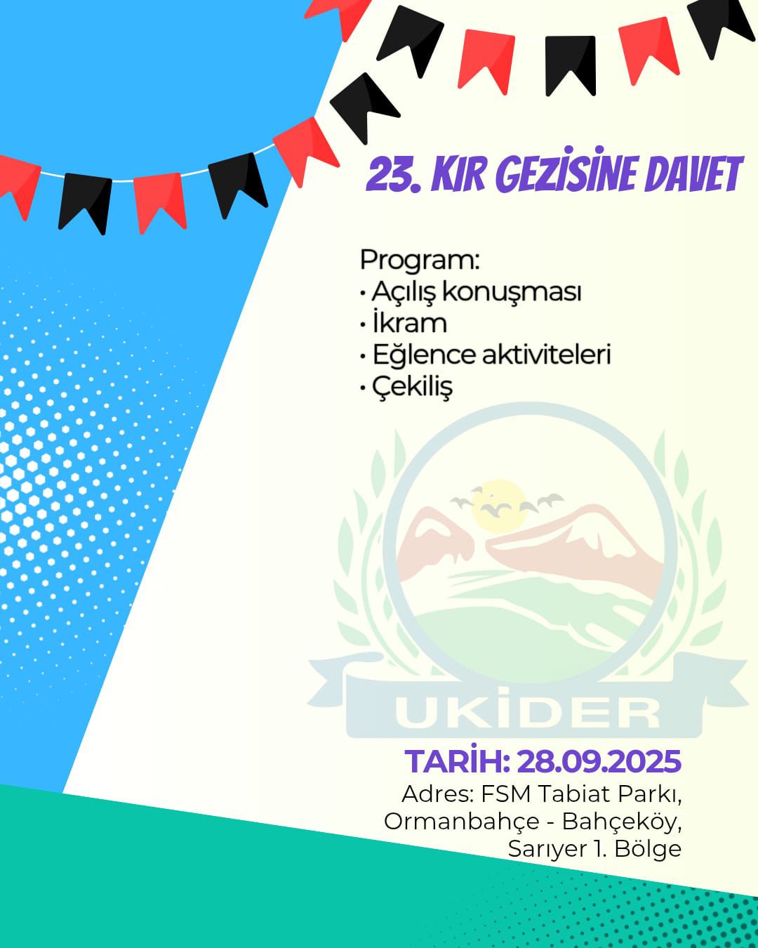 Bu yıl 23.sü düzenlenecek olan Geleneksel UKİDER Kır Gezisi, 28 Eylül 2025 Pazar günü FSM Tabiat Parkı'nda gerçekleştirilecek. Kır gezisi programı şu şekilde;